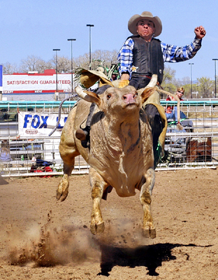 I'm curious as to which mode you had the G in? This shot is spectacular--the rider's expression, the bull's expression, as well as his NBA-like vertical leap, the dirt streamers and small dust clouds--someone could shoot a hundred frames and not snag one as good. I'd be happier with less background focus but consider it a minor flaw in a great image. I'm not sure you'd have gotten enough of the rider and bull in focus had you opened up much. --Rick