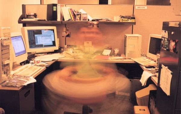 Mario, great stuff. I like the contrast of your color (with the pea-green shirt!) to the environment around you. Three computers?