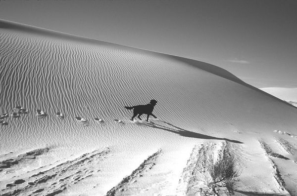 this is quite bertolluci..... or alternatively a thesiger without the Bedouin boy.... not sure the dos adds anything to a generally nice image.... would be interested in seeing the same thing shot with just the dogs footprints and possibly less of the vegetation in the foreground...