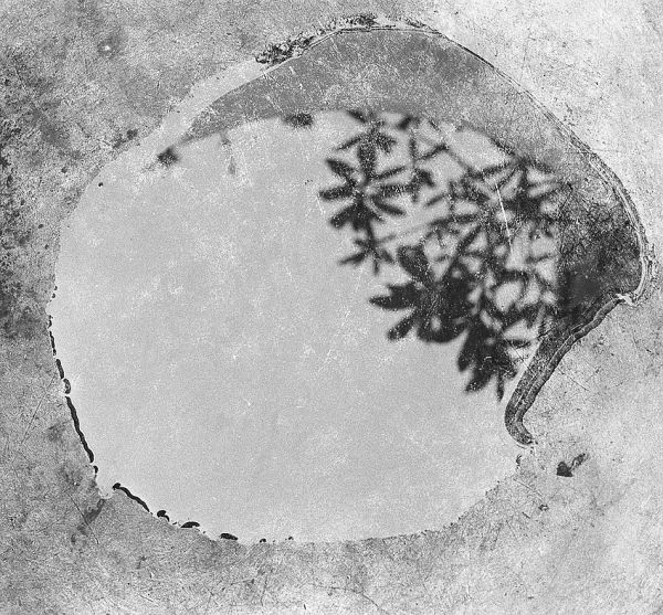 Leaves and sky reflected in the water in a steel bucket.