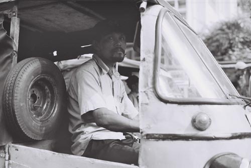 This is a picture of a becak driver, a 3 wheeled diesel spewing scooter which many in Indonesia use as an affordable mode of transportation.