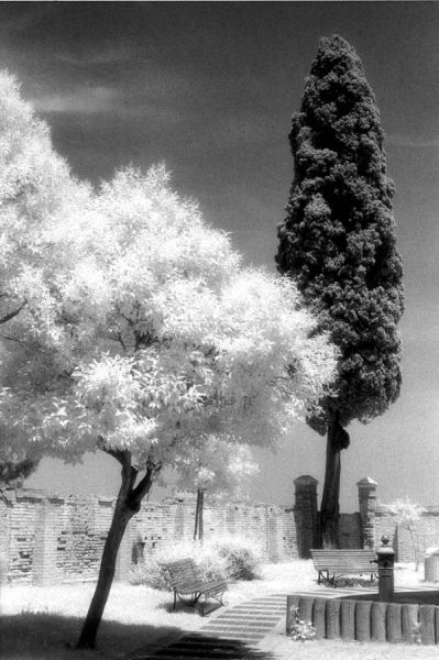 The island of Burano is at the north end of the Venice lagoon. Most photographers concentrate on the famous vibrant colours of the houses. I chose a corner of a secluded park and used Kodak mono IR to contrast the deciduous (white) with the coniferous (dark) leaves under the intense Mediterranean sunshine. Unfortunately my cheap scanner doesn't do the picture justice and the resolution of the foliage has been lost.
