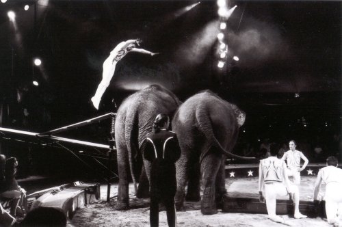 I love how you caught the image just as he's flying up over the elephants. I like the composition: he's a bright spot that counterbalances the other men in the right-hand corner. I also like how the adults all seem to be non-chalant about the flying man--especially the central figure (ringmaster?)--while you've caught the little child, mesmerized, in the left-hand corner.