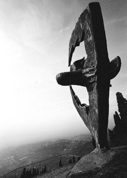 Sculpture at Fiesole, near Florence, looking out over Tuscan hills.