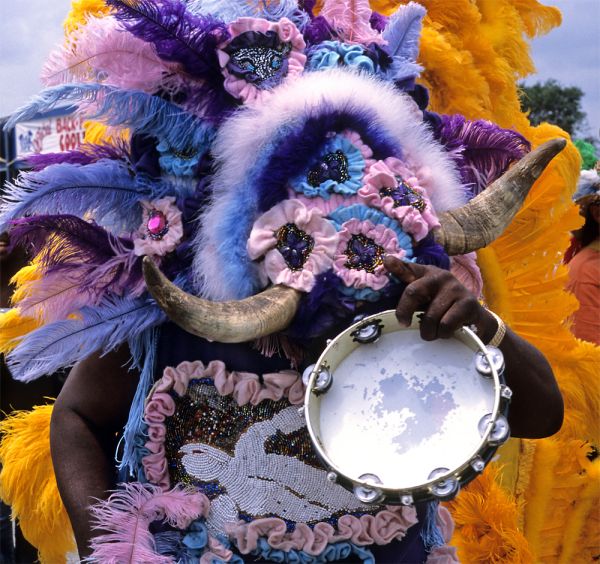 Jazz Fest 2006, New Orleans. If there is any doubt that you need to keep your distance from a Mardi Gras indian chief, this fellow will point it out to you -- cut off index finger and all.
