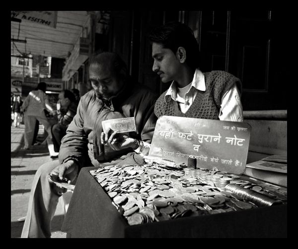 The sign in Hindi says: "Old and torn notes and coins are bought and sold here." Photograph taken on a street in Chandni Chowk, Old Delhi.