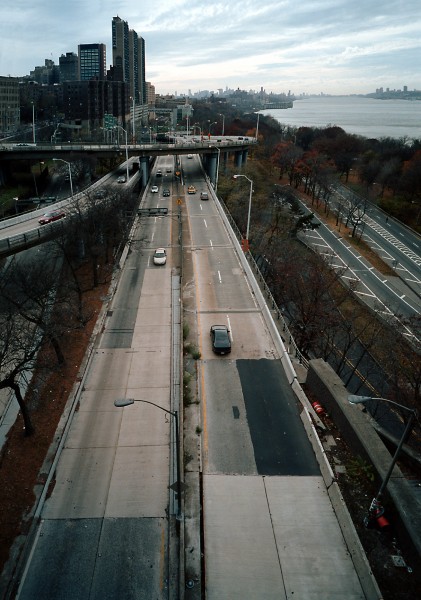 This image required considerable manipulation to get it right. The 21mm lens made the buildings in the uper part of the picture lean out. I isolated these upper quadrants and corrected the distortion. Then I pulled the lower corners a bit to get them line up. The bottom of the picture looks almost straignt down. I used the unsharp mask on this one (finally!). This image was taken from the New York side of the George Washington Bridge sometime in early November 2001. I took 2 pictures of this scean; about 4 feet apart; to make a stereo pair. It looks really cool in 3D.