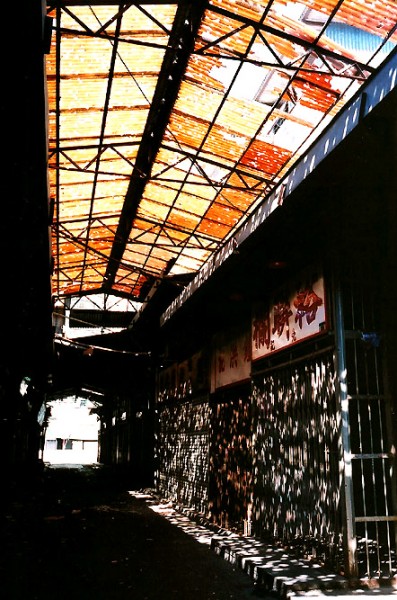 This is an old fruit market located at YauMaTei in Hong Kong. The sheet iron roof forming the artium is heavily eroded so that sun ray can pass through. The shops in the market were all closed due to Chinese New Year, making this busy place silent at that moment.