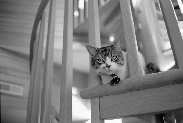 I love this shot (not only because it reminds me of my old Himalayan's tendency to view the family from our loft), it gives a feel for the spaciousness of the interior & staircase, a nice open feeling (that is supported by the cat's sang froid -- well captured.