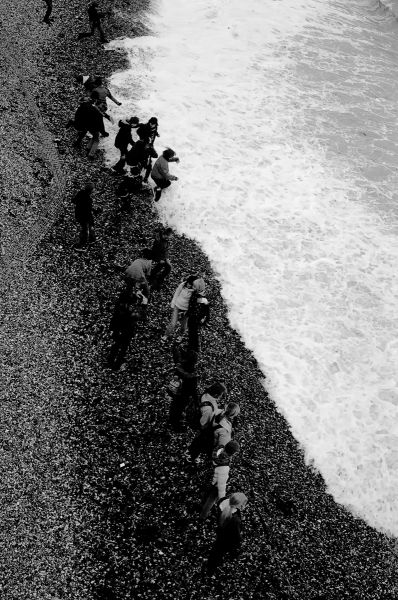 French school children playing a game of dare against the sea near Beachy Head in Sussex.
