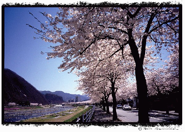 This is my home town YAMAGATA, april, 2000. The cherry trees are in full blossom, riverside street. G2,28Biogon,RDPII