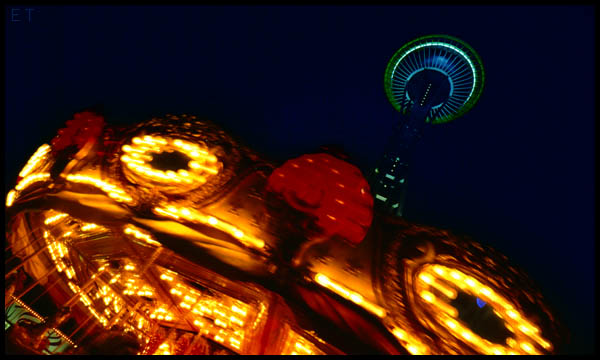 The Merry go'round just halted to a stop.. but I captured the last rush. This contrasts with the precise underbelly of the Space Needle. G2 21mm