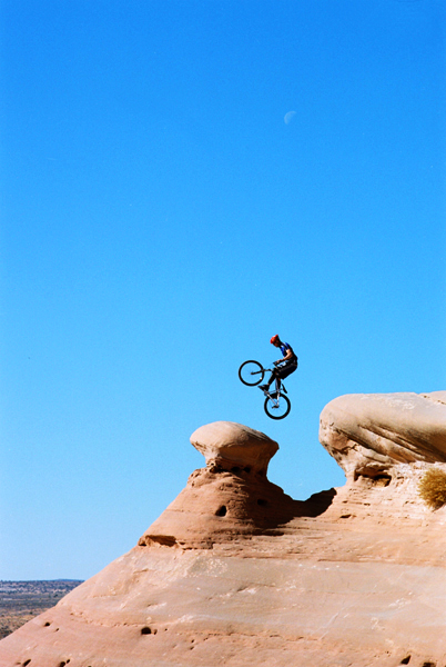 Shot with G2 90mm Kodak Supra 100 at 1/700th f5.6. Location: Bartlett wash, Moab, Utah. Rider: Per Bjorkebaum.