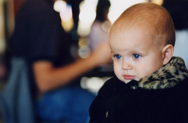 I tend to use the 35mm as my primary portait lens. My daughter, shortly before her first birthday, taken at a coffee shop in Arlington, VA. Click on image for larger version (500k).