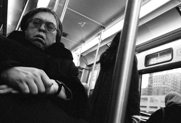 This was the women sitting next to the guy in "To Work 1" I shot that one from my lap without looking. G1/Biogon 28mm Ilford HP5 @1600ASA developed in Rodinal (1+25) scanned in Minolta Dimage Duo II with Vuescan.