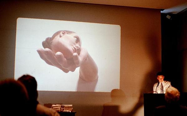 A guard at the Neuberger Musem of Art would not allow me to photograph this sculpture by Nina Levy. I took this shot of my son giving a presentation on the work with a museum slide.