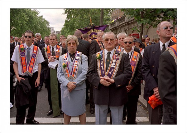 the description, 'deadly serious, fixed jaws, looking straight ahead and sadly, not a smile to be seen' is usually summed up in good aul Norn Iron as being 'Poe Faced'. The poe faces and stance of this lodge would suggest they have been told by the local Concerned Residence Committee in that part of London that they won't be allowed to walk down the road. Now everybody can see the photographic evidence of the harassment the Orange Lodge faces. Didn't someone say a photo can take the place of a thousand words.