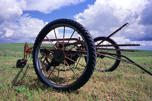 I've always been interested in the distortion that a near-far perspective allows, so I decided to see how large I could make the wheel on a hay rake appear (with my recently acquired 28/2.8 Biogon, manual focus at about 2m).