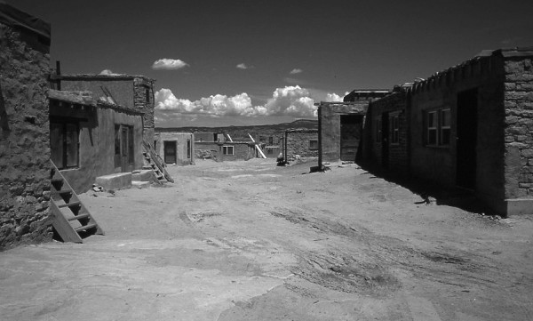 I just love this place. As I said in an earlier photo Acoma Pueblo is the oldest continuously inhabited city in the US. About a thousand years. This is looking down one of the streets. I did this in color but changed it to B&W in PS. There is not much color at Acoma. Some streets are real wide and some are very narrow. The entire city is on top of a 300 foot flat mesa. They have no plumbing so there are alot of outhouses. They collect water in cisterns.