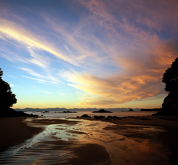 Sunrise over Mosquito Bay in Abel Tasman N.P. New Zealand in late January 2001.Shot with G2/45mm and cropped. Fuji Reala. Exposure unrecorded. (It was 5.45 in the morning...)
