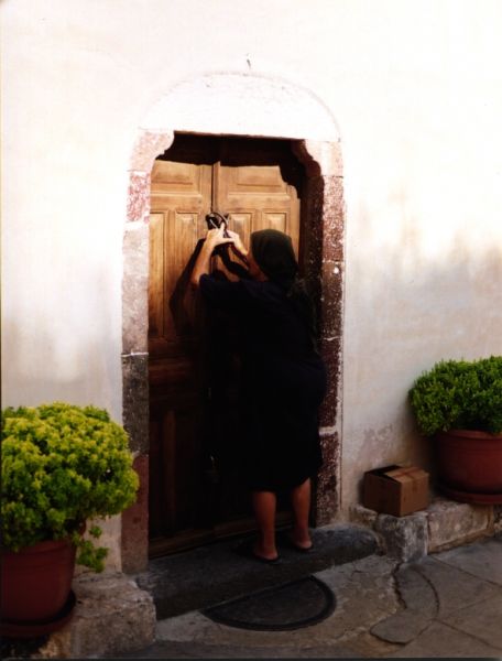 An old woman (possibly a nun) closing the doors of a church in Santorini, Greece.