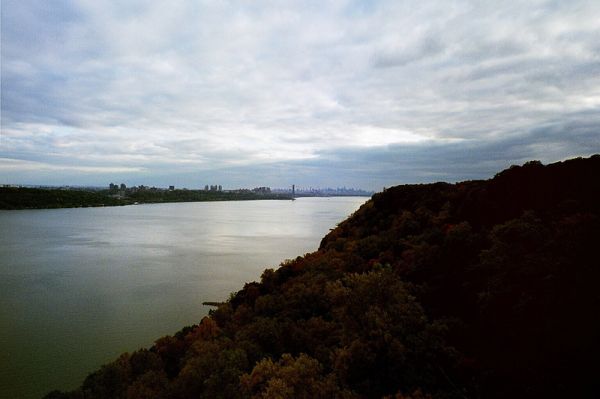 View at dusk of the Hudson River and northern Manhattan from the Palisades in New Jersey. Click for a larger image.