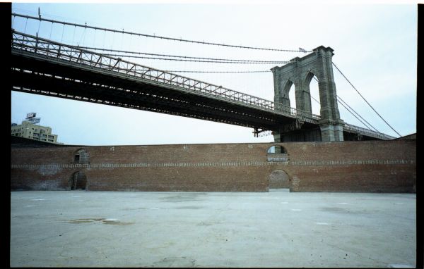 View of Brooklyn Bridge, from a park (old fort) on the Brooklyn side before dusk.