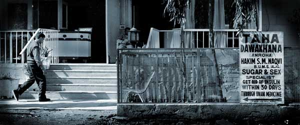 A deadly combination indeed. Who is this Mr Naqvi? What is his BUMS qualification? Why is ALIG in brackets? Why would anyone want to get rid of all their insulin in thirty days? And what is UNANI medicine? Apologies to all non-UK folk who won't know who Ali G is. Contax G1, 45mm, Ilford XP2