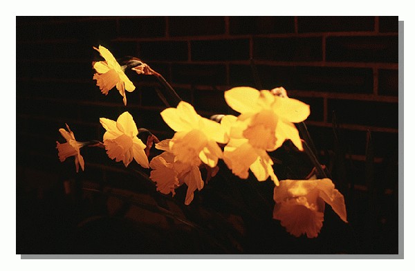 Difficult shot, but I'm puzzled by where the light was from - the moon or room light? I'd plumb for the latter given the colour of the daffs, but if this was an autumn moon... It took me a while to see on screen, but the brickwork could be quite complimentary, though there is some stuff catching the light at the bottom of the picture which has the same tone as the brickwork and does intrude. Since that would get worse if you brought the brickwork out, I'd suggest keeping the BG as dark as poss. Nonetheless, the overall effect and teh difficulty marks this one up, DOF notwithstanding.