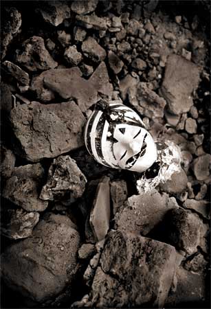 A doll lies in the earthquake rubble G1, 45mm, Ilford XP2