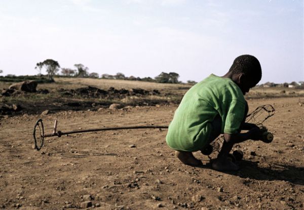 Louis, the composition is perfect--the end of the wire toy follows the same parallel as the line of trees in the horizon. Could he have been wearing a more complimentary color for this shot?? The green shirt is vibrant against the earth tones, and I am really drawn to images taken in midday and/or with figures buried in deep shadow (his face.) Very arresting photo.