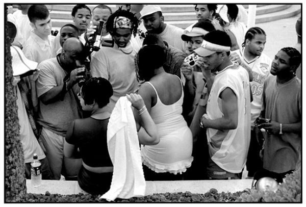 More from Black College Reunion (BCR). These two women were wearing see through clothing with nothing underneath in front (you can see a thong on one of the women) and found themselves trapped behind a sea of men with cameras and video cameras. It really is a wild time. Shot on Tmax 400.