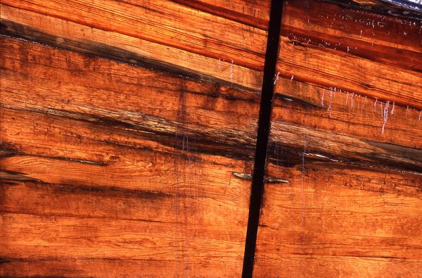 Wood on the side of an old boat. I wonder howmany times it has been sanded and varnished.